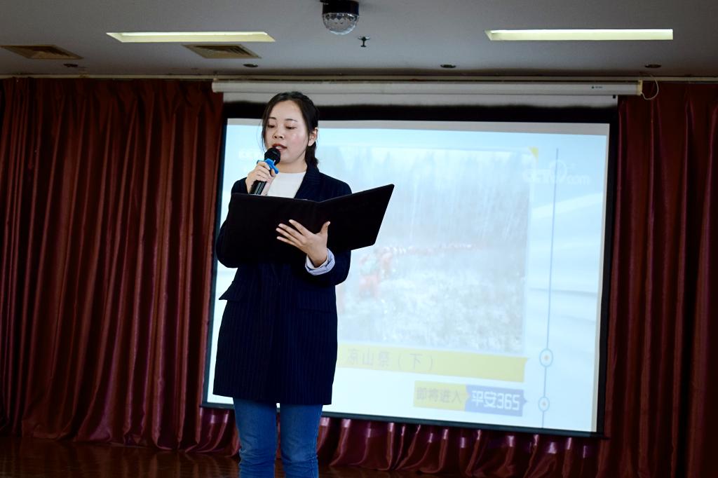 第二环节为诵读经典。“重读奇文,停眸处,斑斑碧血。书案上,景星麟凤,几多豪杰。壮志常随云浪起,雄躯争与山河裂。好头颅换取九州同,心如铁。……对边尘此日又嚣嚣,思英烈。”冯彩华老师带领大家饱含感情地诵读了《满江红·重读<革命烈士诗抄>感赋》,深刻体会到了革命先烈们胸怀祖国、壮志凌云、不怕牺牲、无私无畏的铮铮铁骨和浩然正气。