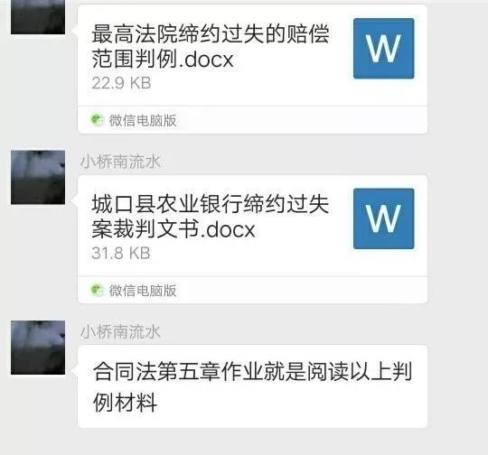 三、利用微信向学生传递裁判文书和教学资料。以往法学教育中很少利用真实裁判文书进行教学,主要困难可能一是裁判文书很难搜寻获取,另一个困难就是向学生大量复制分发既需要经费也耗费人工和精力。但在4G和微信时代这些障碍已经不存在。案情较为复杂的案例文书可以在上课前一两天通过班级微信群发给学生提前了解、预习,课堂上简单讲解的案例文书会在课后微信传给学生进行详细学习了解。