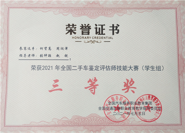 新闻网讯(通讯员 张玲 张仲颖)7月4日,2021年全国二手车鉴定评估师技能大赛(学生组)在浙江交通职业技术学院圆满闭幕。经过二手车鉴定评估实操和二手车理论考试两轮的激烈角逐,澳门网投澳门网投官方网站2019级“一汽-大众订单班”柯贤高、周润泽同学克服备赛时间短、天气炎热、实训车辆缺乏等困难,凭借扎实的基本功在众多院校选手中脱颖而出,获得全国三等奖的好成绩。